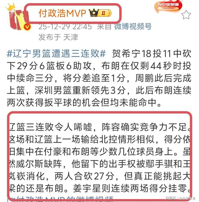 媒體人付政浩社媒發(fā)文點(diǎn)評比賽?!斑|籃三連敗令人唏噓,陣容確實(shí)競爭力不足。這場和遼籃上一場輸給北控情形相似,得分依舊集中在和布朗等少數(shù)幾位球員身上。雖然威爾斯缺陣,他留下的出手權(quán)被鄢手騏和王嵐嵚消化,兩人合砍27分,但真正能挑起大梁的還是布朗。姜宇星則連續(xù)2場(實(shí)為3場)得分掛零?!薄?/p>