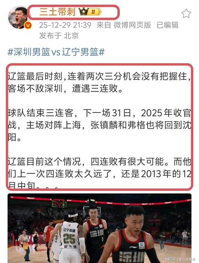 遼寧3連敗,媒體人“三土帶刺”社媒發(fā)文點(diǎn):“遼籃最后時(shí)刻,連著兩次三分機(jī)會沒有把握住,客場不敵深圳,遭遇三連敗。球隊(duì)結(jié)束三連客,下一場31日,2025年收官戰(zhàn),主場對陣,張鎮(zhèn)麟和弗格也將回到沈陽。遼籃目前這個(gè)情況,四連敗有很大可能。而他們上一次四連敗太久遠(yuǎn)了,還是2013年的12月中旬。”。