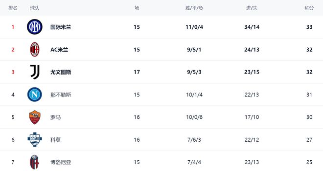 在積分榜上,國際米蘭以33分高居榜首。不過,國際米蘭的領(lǐng)先優(yōu)勢很少。AC米蘭拿到32分,排第2,只落后1分。尤文圖斯贏球之后,暫時升到第2名,也是32分。不過,尤文圖斯踢了17場聯(lián)賽,比米蘭雙雄都要多踢2場。那不勒斯總積分是31分,排名掉到第4。羅馬以30分排名第5。前5的球隊差距最多只有3分,冠軍的爭奪真是太激烈了??颇?7分排名第6。博洛尼亞25分排名第7。